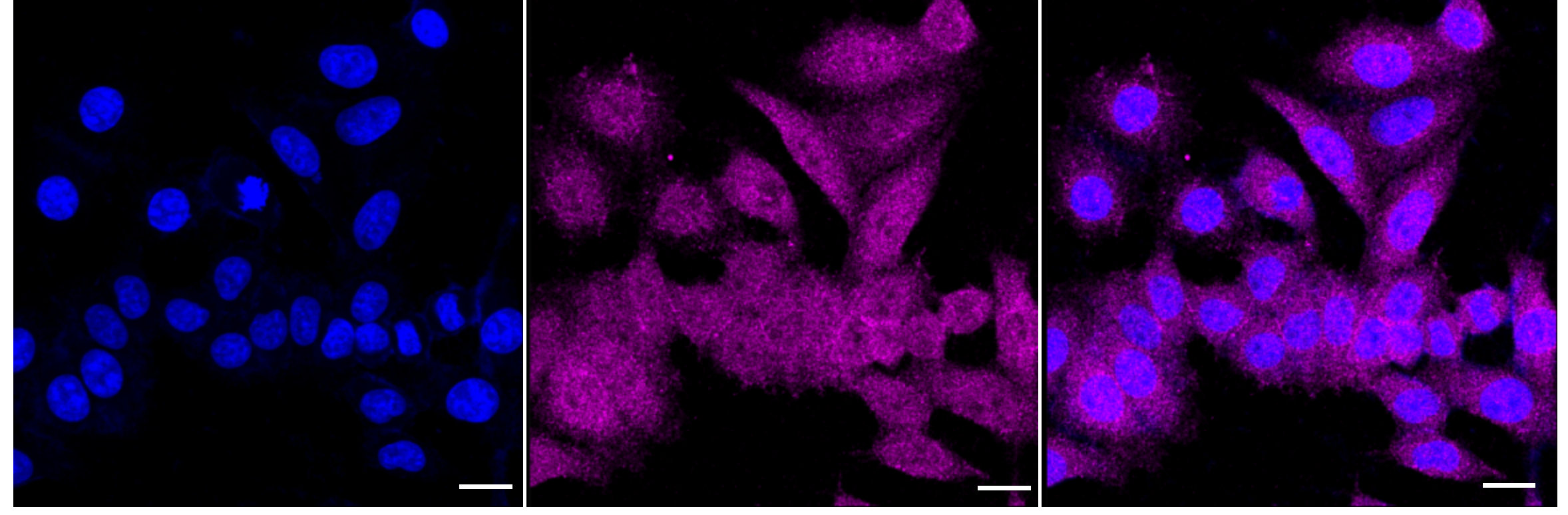 Immunocytochemical staining of HepG2 cells with CRADD antibody. Nuclei were stained blue with DAPI; CRADD was stained magenta with Alexa Fluor? 647. Images were taken using Leica stellaris 5. Protein abundance based on laser Intensity and smart gain: Medium. Scale bar: 20 μm.