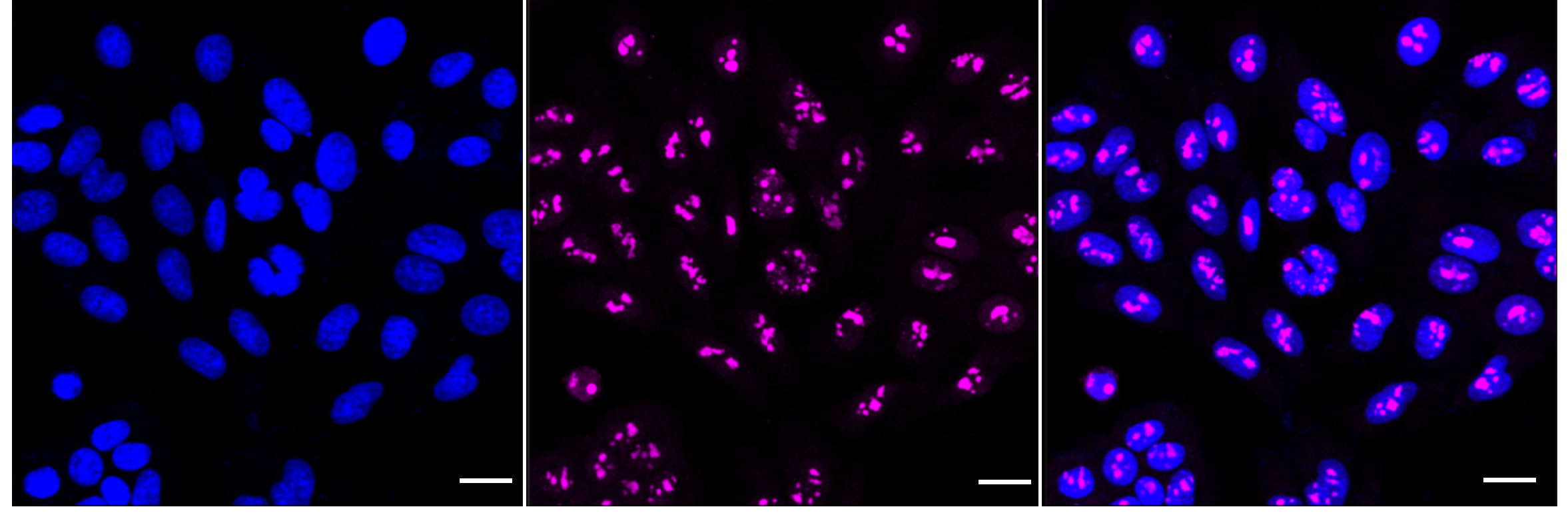 Immunocytochemical staining of HepG2 cells with CGRP receptor component antibody. Nuclei were stained blue with DAPI; CGRP receptor component was stained magenta with Alexa Fluor? 647. Images were taken using Leica stellaris 5. Protein abundance based on laser Intensity and smart gain: High. Scale bar: 20 μm.
