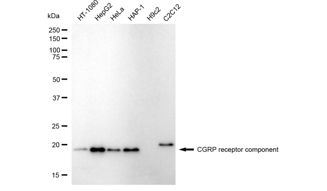 Western blotting analysis using CGRP receptor component antibody. Total cell lysates (30 μg) from various cell lines were loaded and separated by SDS-PAGE. The blot was incubated with CGRP receptor component antibody and HRP-conjugated goat anti-rabbit secondary antibody respectively.