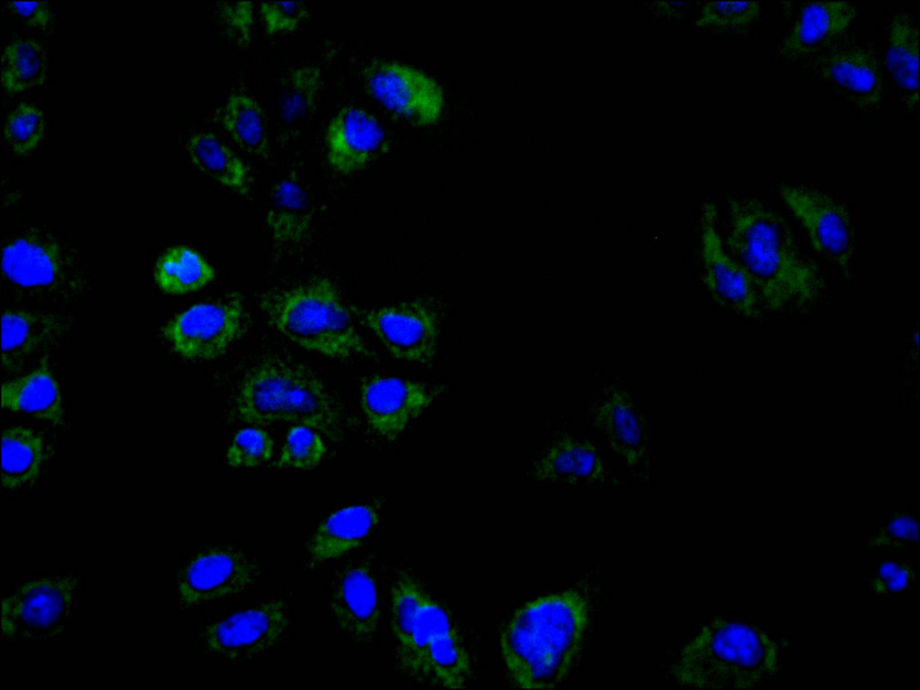 Immunofluorescence staining of Hela cell with CSB-RA056302A0HU at 1:50, counter-stained with DAPI. The cells were fixed in 4% formaldehyde, permeabilized using 0.2% Triton X-100 and blocked in 10% normal Goat Serum. The cells were then incubated with the antibody overnight at 4°C. The secondary antibody was Alexa Fluor 488-congugated AffiniPure Goat Anti-Rabbit IgG(H+L).