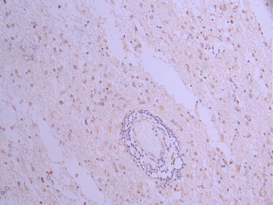 IHC image of CSB-RA056302A0HU diluted at 1:100 and staining in paraffin-embedded human glioma cancer performed on a Leica BondTM system. After dewaxing and hydration, antigen retrieval was mediated by high pressure in a citrate buffer (pH 6.0). Section was blocked with 10% normal goat serum 30min at RT. Then primary antibody (1% BSA) was incubated at 4°C overnight. The primary is detected by a Goat anti-rabbit polymer IgG labeled by HRP and visualized using 0.05% DAB.