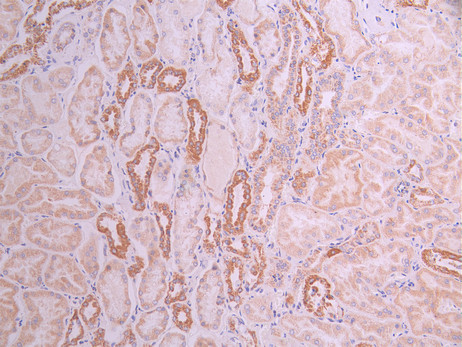 IHC image of CSB-RA056302A0HU diluted at 1:100 and staining in paraffin-embedded human kidney tissue performed on a Leica BondTM system. After dewaxing and hydration, antigen retrieval was mediated by high pressure in a citrate buffer (pH 6.0). Section was blocked with 10% normal goat serum 30min at RT. Then primary antibody (1% BSA) was incubated at 4°C overnight. The primary is detected by a Goat anti-rabbit polymer IgG labeled by HRP and visualized using 0.05% DAB.