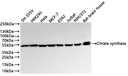Positive WB detected in: SH-SY5Y whole cell lysate(30μg), HEK293 whole cell lysate(30μg), Hela whole cell lysate(30μg), MCF-7 whole cell lysate(30μg), K562 whole cell lysate(30μg), Jurkat whole cell lysate(30μg), NIH/3T3 whole cell lysate(30μg), Rat brain tissue lysate(30μg)