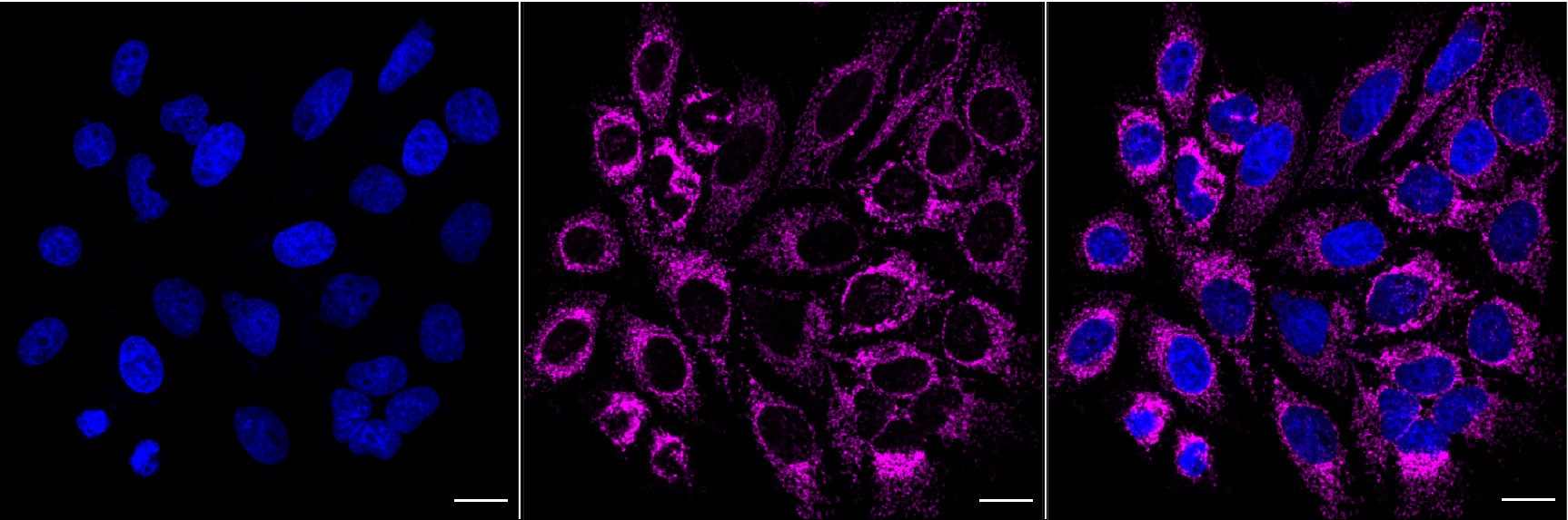 Immunocytochemical staining of HepG2 cells with Citrate synthetase antibody. Nuclei were stained blue with DAPI; Citrate synthetase was stained magenta with Alexa Fluor? 647. Images were taken using Leica stellaris 5. Protein abundance based on laser Intensity and smart gain: High. Scale bar, 20 μm.