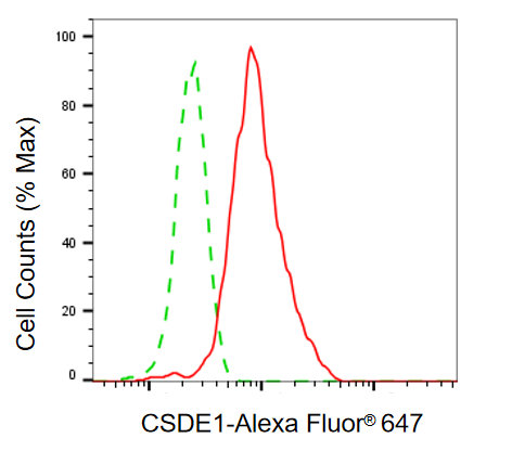 Flow cytometric analysis of CSDE1 expression in C2C12 cells using CSDE1 antibody. Green, isotype control; red, CSDE1.