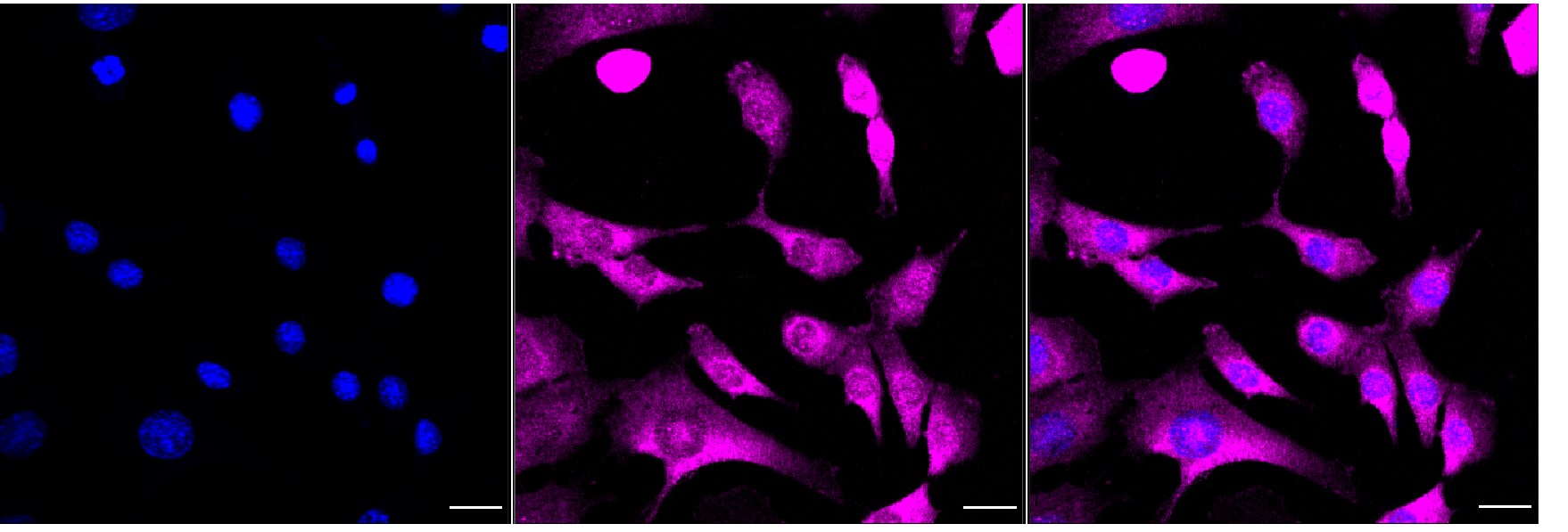 Immunocytochemical staining of C2C12 cells with CSDE1 antibody. Nuclei were stained blue with DAPI; CSDE1 was stained magenta with Alexa Fluor? 647. Images were taken using Leica stellaris 5. Protein abundance based on laser Intensity and smart gain: Medium. Scale bar, 20 μm.