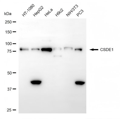 Western blotting analysis using CSDE1 antibody. Total cell lysates (30 μg) from various cell lines were loaded and separated by SDS-PAGE. The blot was incubated with CSDE1 antibody and HRP-conjugated goat anti-rabbit secondary antibody respectively.