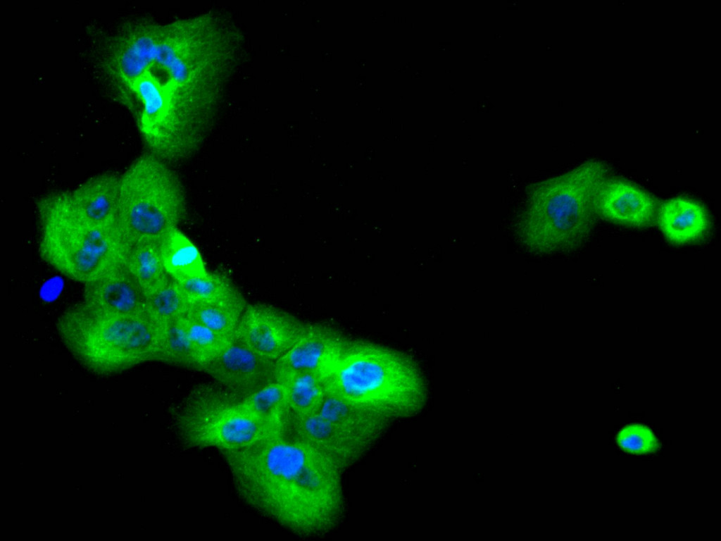 Immunofluorescence staining of A431 cell with CSB-RA901089A0HU at 1:50, counter-stained with DAPI. The cells were fixed in 4% formaldehyde, permeabilized using 0.2% Triton X-100 and blocked in 10% normal Goat Serum. The cells were then incubated with the antibody overnight at 4°C. The secondary antibody was Alexa Fluor 488-congugated AffiniPure Goat Anti-Rabbit IgG(H+L).