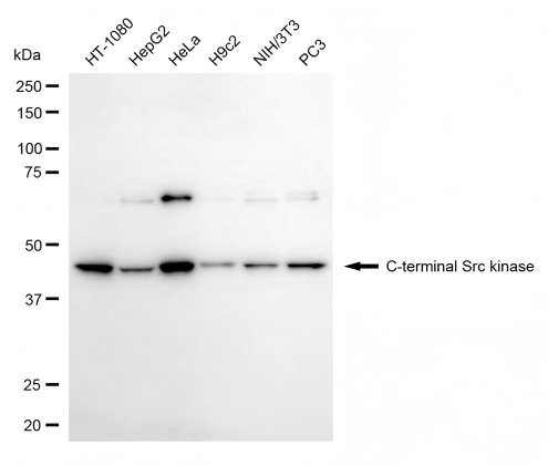 Western blotting analysis using C-terminal src kinase antibody. Total cell lysates (30 μg) from various cell lines were loaded and separated by SDS-PAGE. The blot was incubated with C-terminal src kinase antibody and HRP-conjugated goat anti-rabbit secondary antibody respectively.
