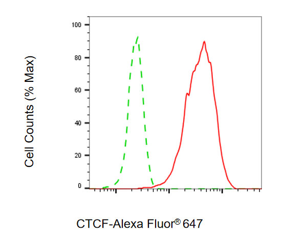 Flow cytometric analysis of CTCF expression in C2C12 cells using CTCF antibody. Green, isotype control; red, CTCF.