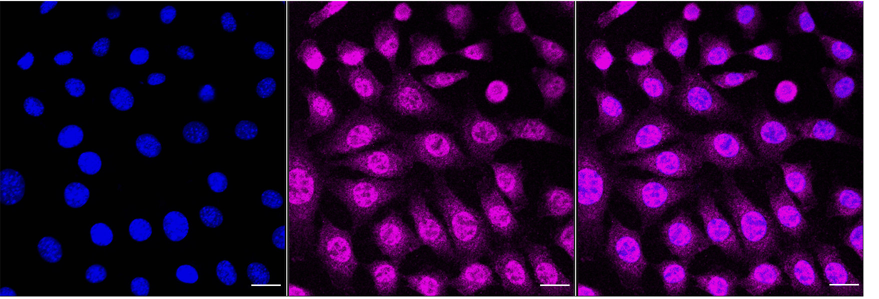 Immunocytochemical staining of C2C12 cells with CTCF?antibody. Nuclei were stained blue with DAPI; CTCF was stained magenta with Alexa Fluor? 647. Images were taken using Leica stellaris 5. Protein abundance based on laser Intensity and smart gain: Medium. Scale bar, 20 μm.