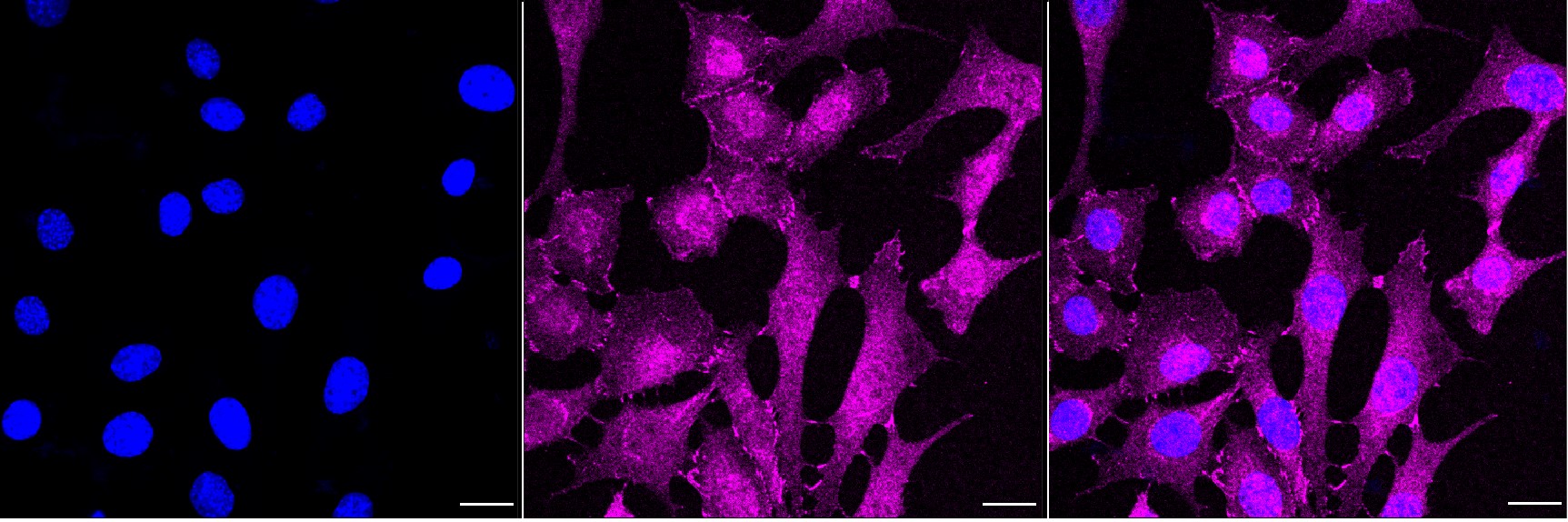 Immunocytochemical staining of C2C12 cells with Catenin alpha 1 antibody. Nuclei were stained blue with DAPI; Catenin alpha 1 was stained magenta with Alexa Fluor? 647. Images were taken using Leica stellaris 5. Protein abundance based on laser Intensity and smart gain: Medium. Scale bar, 20 μm.