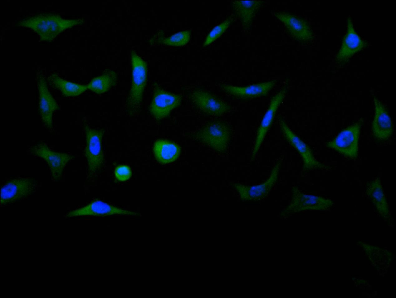 Immunofluorescence staining of Hela cell with CSB-RA006169MA1HU at 1:200, counter-stained with DAPI. The cells were fixed in 4% formaldehyde and blocked in 10% normal Goat Serum. The cells were then incubated with the antibody overnight at 4C. The secondary antibody was Alexa Fluor 488-congugated AffiniPure Goat Anti-rabbit IgG(H+L).