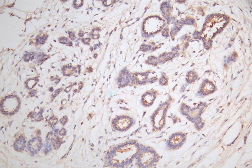 IHC image of CSB-RA006169MA1HU diluted at 1:100 and staining in paraffin-embedded human breast tissue performed on a Leica BondTM system. After dewaxing and hydration, antigen retrieval was mediated by high pressure in a citrate buffer (pH 6.0). Section was blocked with 10% normal goat serum 30min at RT. Then primary antibody (1% BSA) was incubated at 4°C overnight. The primary is detected by a Goat anti-rabbit polymer IgG labeled by HRP and visualized using 0.05% DAB.