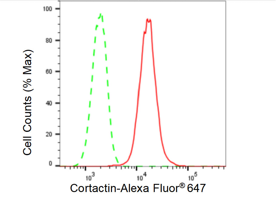 Flow cytometric analysis of Cortactin expression in H9c2 cells using Cortactin antibody. Green, isotype control; red, Cortactin.