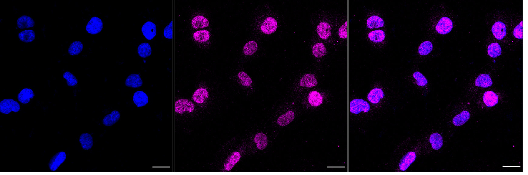 Immunocytochemical staining of HT-1080 cells with Cullin 1 antibody. Nuclei were stained blue with DAPI; Cullin 1 was stained magenta with Alexa Fluor? 647. Images were taken using Leica stellaris 5. Protein abundance based on laser Intensity and smart gain: Medium. Scale bar, 20 μm.