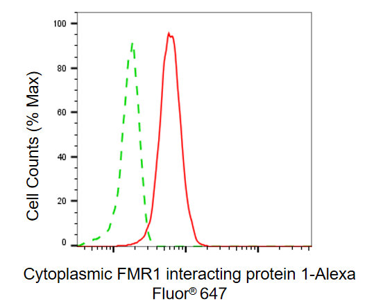 Flow cytometric analysis of cytoplasmic FMR1 interacting protein 1 expression in HepG2 cells using cytoplasmic FMR1 interacting protein 1 antibody. Green, isotype control; red, cytoplasmic FMR1 interacting protein 1.
