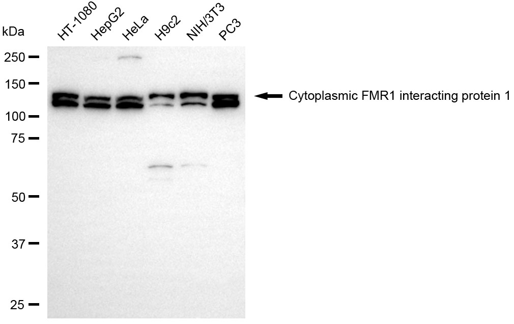 Western blotting analysis using cytoplasmic FMR1 interacting protein 1 antibody. Total cell lysates (30 μg) from various cell lines were loaded and separated by SDS-PAGE. The blot was incubated with cytoplasmic FMR1 interacting protein 1 antibody and HRP-conjugated goat anti-rabbit secondary antibody respectively.