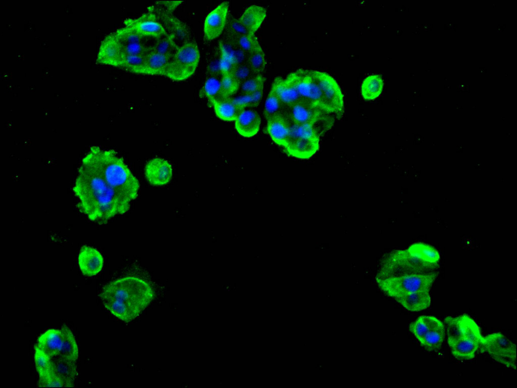 Immunofluorescence staining of HepG2 cell with CSB-RA234050A0HU at 1:50, counter-stained with DAPI. The cells were fixed in 4% formaldehyde, permeabilized using 0.2% Triton X-100 and blocked in 10% normal Goat Serum. The cells were then incubated with the antibody overnight at 4°C. The secondary antibody was Alexa Fluor 488-congugated AffiniPure Goat Anti-Rabbit IgG(H+L).