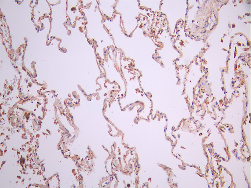 IHC image of CSB-RA869286A0HU diluted at 1:100 and staining in paraffin-embedded human lung tissue performed on a Leica BondTM system. After dewaxing and hydration, antigen retrieval was mediated by high pressure in a citrate buffer (pH 6.0). Section was blocked with 10% normal goat serum 30min at RT. Then primary antibody (1% BSA) was incubated at 4°C overnight. The primary is detected by a Goat anti-rabbit polymer IgG labeled by HRP and visualized using 0.05% DAB.