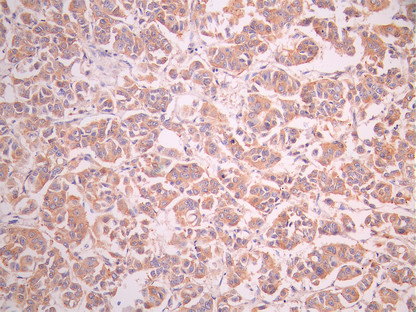 IHC image of CSB-RA869286A0HU diluted at 1:100 and staining in paraffin-embedded human breast cancer performed on a Leica BondTM system. After dewaxing and hydration, antigen retrieval was mediated by high pressure in a citrate buffer (pH 6.0). Section was blocked with 10% normal goat serum 30min at RT. Then primary antibody (1% BSA) was incubated at 4°C overnight. The primary is detected by a Goat anti-rabbit polymer IgG labeled by HRP and visualized using 0.05% DAB.