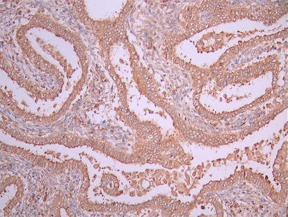 IHC image of CSB-RA546087A0HU diluted at 1:100 and staining in paraffin-embedded human endometrial cancer performed on a Leica BondTM system. After dewaxing and hydration, antigen retrieval was mediated by high pressure in a citrate buffer (pH 6.0). Section was blocked with 10% normal goat serum 30min at RT. Then primary antibody (1% BSA) was incubated at 4°C overnight. The primary is detected by a Goat anti-rabbit polymer IgG labeled by HRP and visualized using 0.05% DAB.