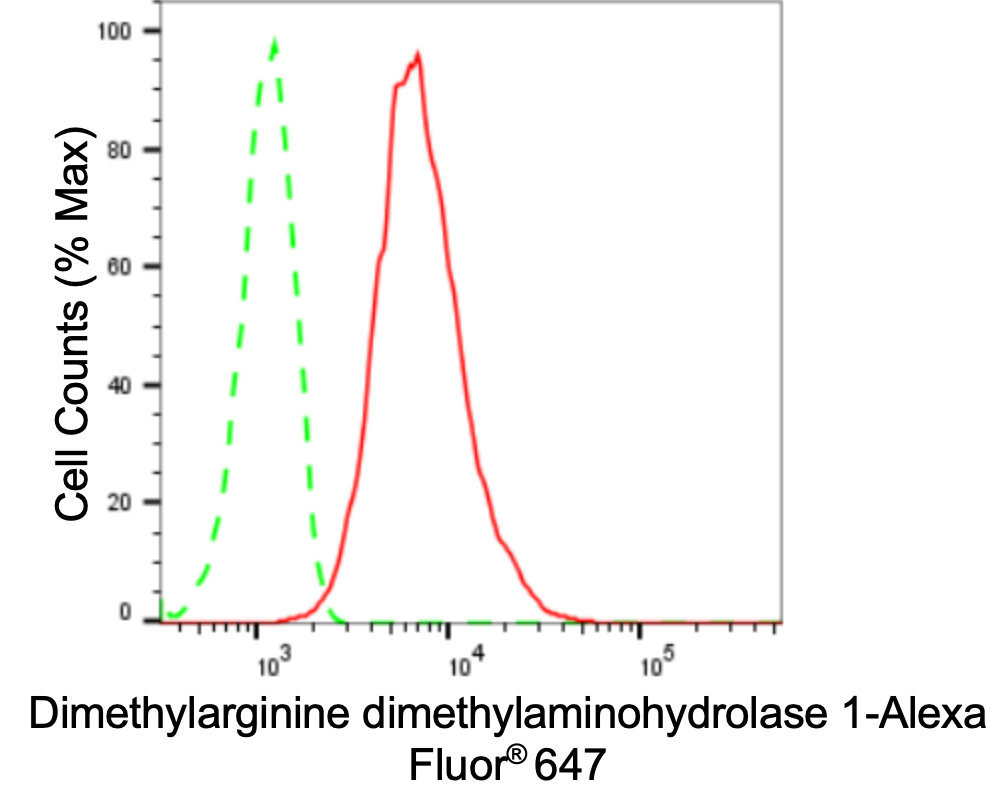 Flow cytometric analysis of Dimethylarginine dimethylaminohydrolase 1 expression in HT-1080 cells using Dimethylarginine dimethylaminohydrolase 1 antibody. Green, isotype control; red, Dimethylarginine dimethylaminohydrolase 1.