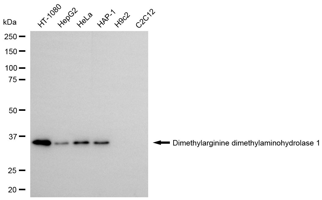 Western blotting analysis using Dimethylarginine dimethylaminohydrolase 1 antibody. Total cell lysates (30 μg) from various cell lines were loaded and separated by SDS-PAGE. The blot was incubated with Dimethylarginine dimethylaminohydrolase 1 antibody and HRP-conjugated goat anti-rabbit secondary antibody respectively.