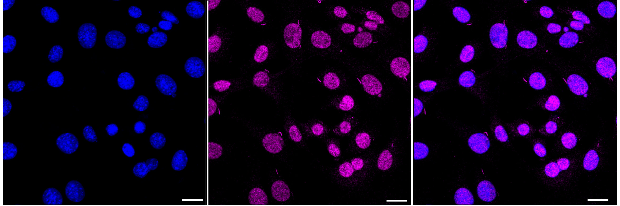 Immunocytochemical staining of C2C12 cells with DDAH2 antibody. Nuclei were stained blue with DAPI; DDAH2 was stained magenta with Alexa Fluor? 647. Images were taken using Leica stellaris 5. Protein abundance based on laser Intensity and smart gain: Medium. Scale bar: 20 μm.