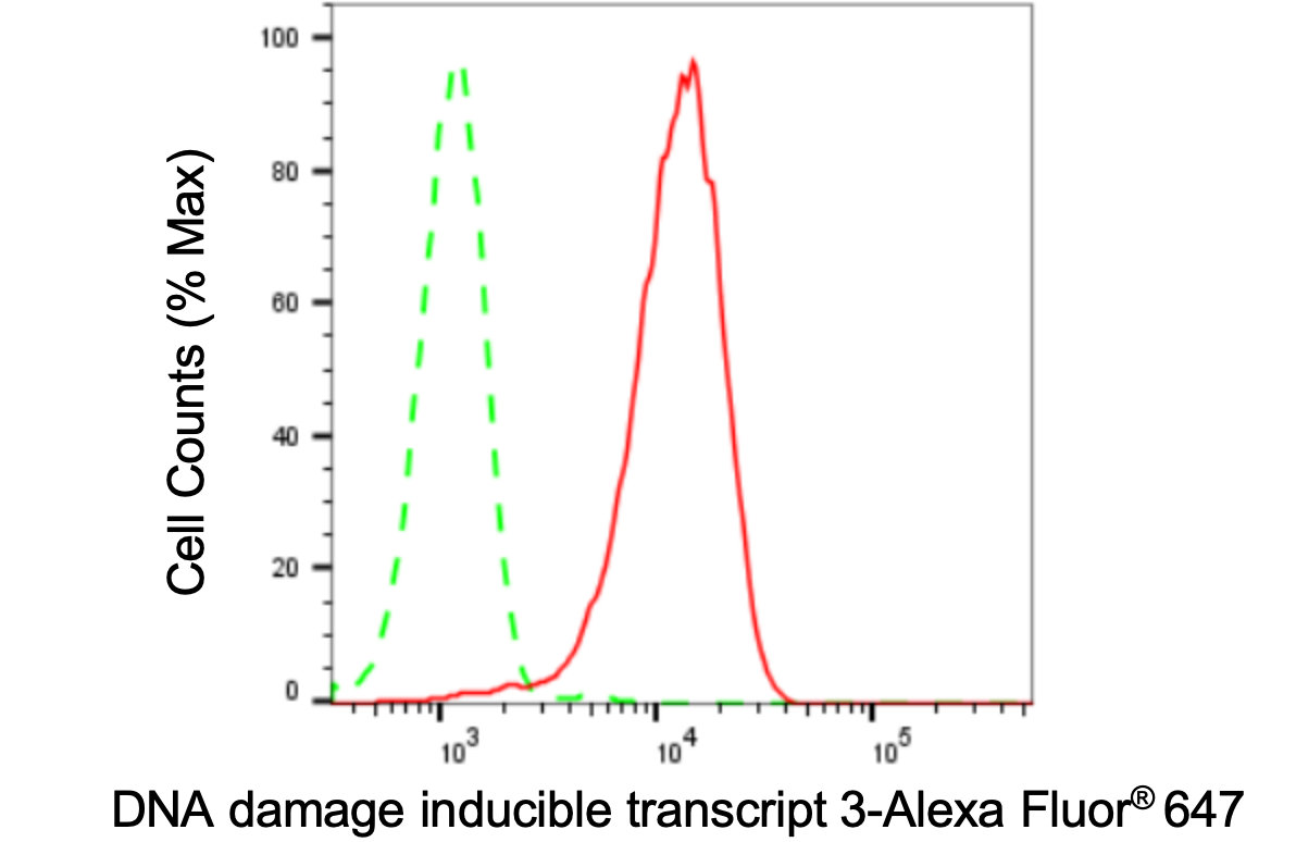 Flow cytometric analysis of DNA damage inducible transcript 3 expression in HepG2 cells using DNA damage inducible transcript 3c antibody. Green, isotype control; red, DNA damage inducible transcript 3.