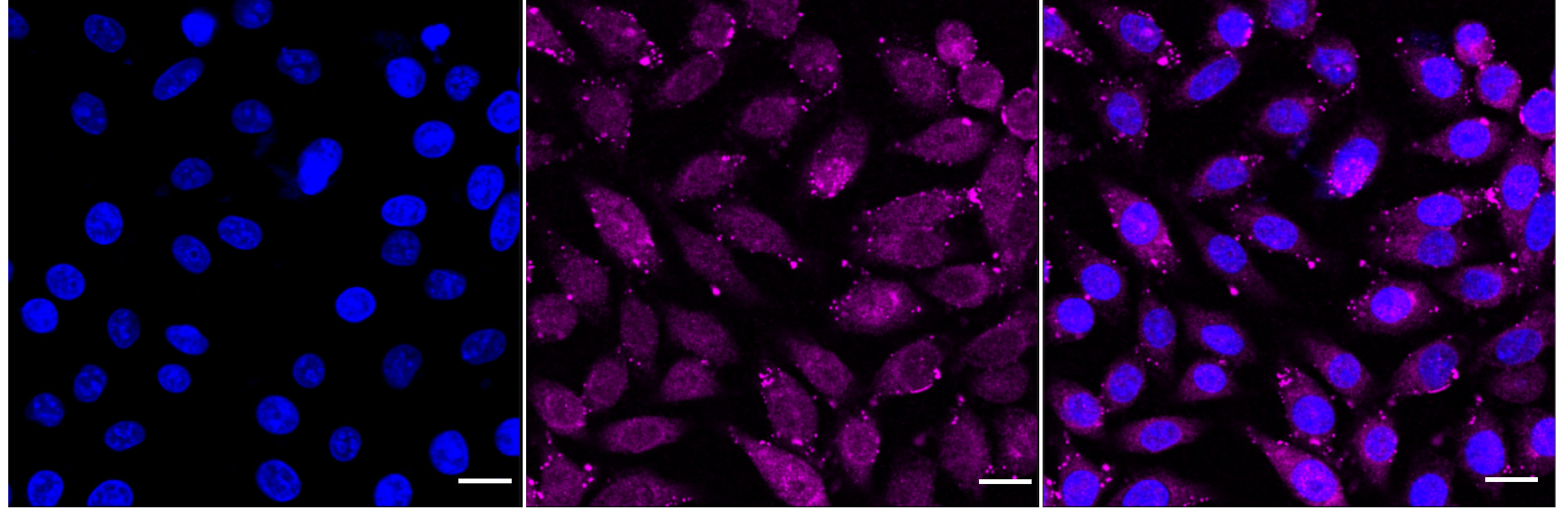 Immunocytochemical staining of HepG2 cells with DNA damage inducible transcript 3 antibody. Nuclei were stained blue with DAPI; DNA damage inducible transcript 3 was stained magenta with Alexa Fluor? 647. Images were taken using Leica stellaris 5. Protein abundance based on laser Intensity and smart gain: Medium. Scale bar: 20 μm.