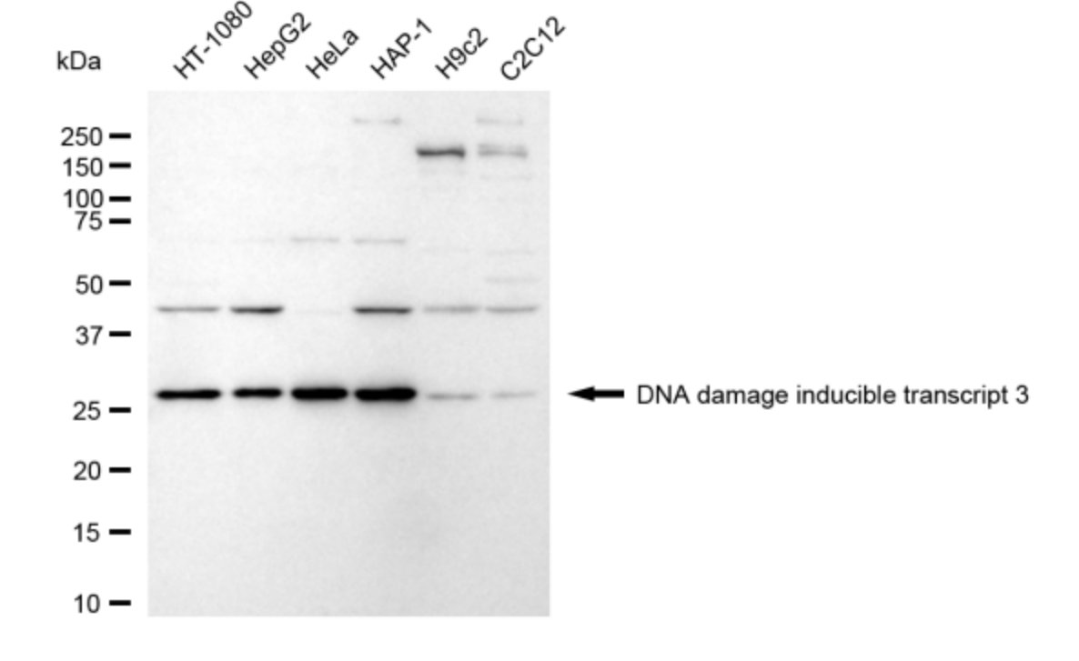 Western blotting analysis using DNA damage inducible transcript 3 antibody. Total cell lysates (30 μg) from various cell lines were loaded and separated by SDS-PAGE. The blot was incubated with DNA damage inducible transcript 3 antibody and HRP-conjugated goat anti-rabbit secondary antibody respectively.