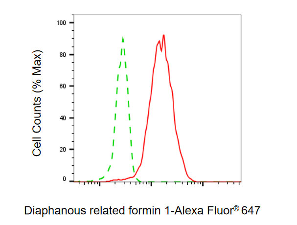 Flow cytometric analysis of Diaphanous related formin 1 expression in HepG2 cells using Diaphanous related formin 1 antibody. Green, isotype control; red, Diaphanous related formin 1.