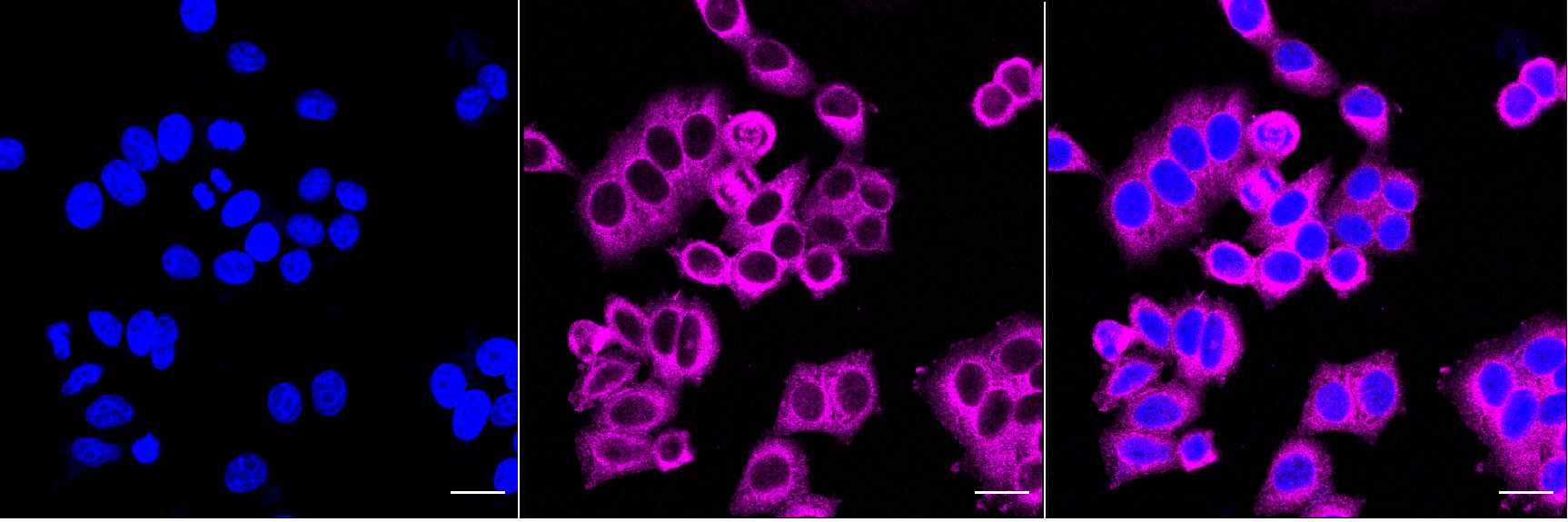 Immunocytochemical staining of HepG2 cells with Diaphanous related formin 1 antibody. Nuclei were stained blue with DAPI; Diaphanous related formin 1 was stained magenta with Alexa Fluor? 647. Images were taken using Leica stellaris 5. Protein abundance based on laser Intensity and smart gain: Medium. Scale bar, 20 μm.