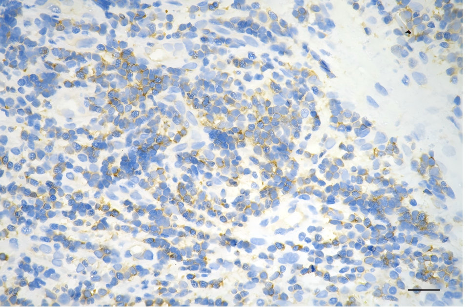 Immunohistochemistry was performed on paraffin-embedded human esophageal carcinoma using diaphanous related formin 1 antibody. Antigen retrieval was done in sodium citrate buffer (pH 6.0). DAB was used for detection, with hematoxylin counterstaining. Images were acquired using a Nikon Ci-L Plus microscope (40× objective). Scale bar: 25 μm.