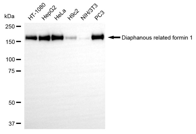 Western blotting analysis using diaphanous related formin 1 antibody. Total cell lysates (30 μg) from various cell lines were loaded and separated by SDS-PAGE. The blot was incubated with diaphanous related formin 1 antibody and HRP-conjugated goat anti-rabbit secondary antibody respectively.