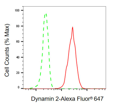 Flow cytometric analysis of dynamin 2 expression in HT-1080 cells using dynamin 2 antibody. Green, isotype control; red, dynamin 2.