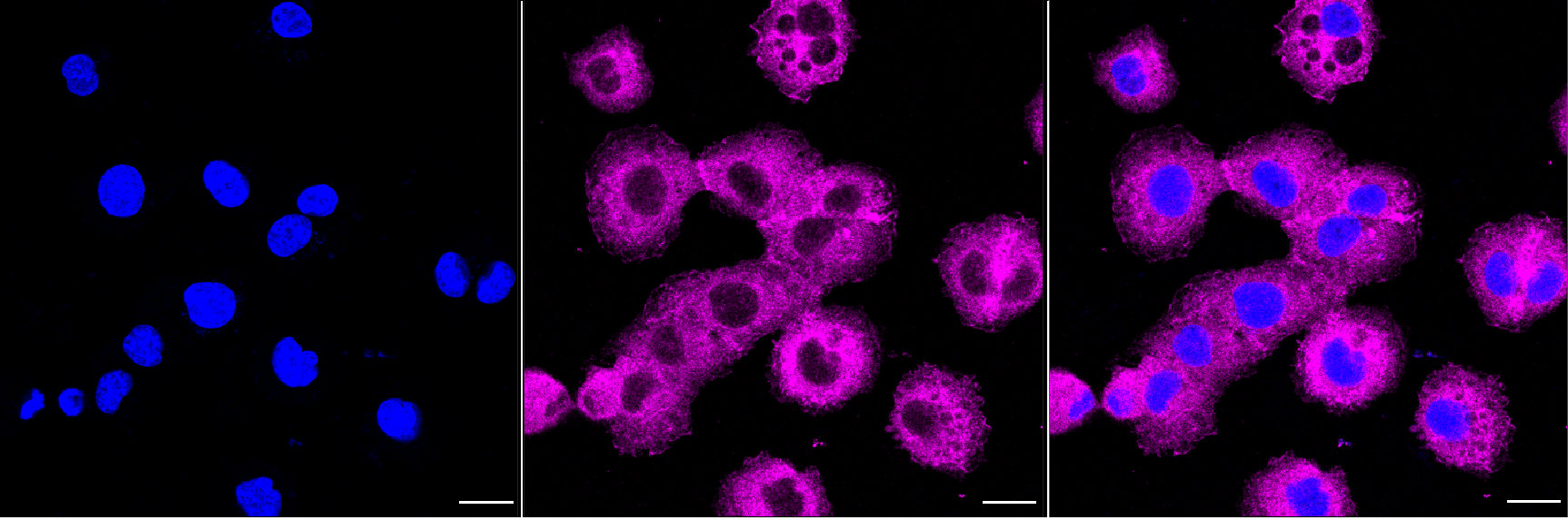Immunocytochemical staining of HT-1080 cells with dynamin 2 antibody. Nuclei were stained blue with DAPI; Dynamin 2 was stained magenta with Alexa Fluor? 647. Images were taken using Leica stellaris 5. Protein abundance based on laser Intensity and smart gain: Medium. Scale bar, 20 μm.