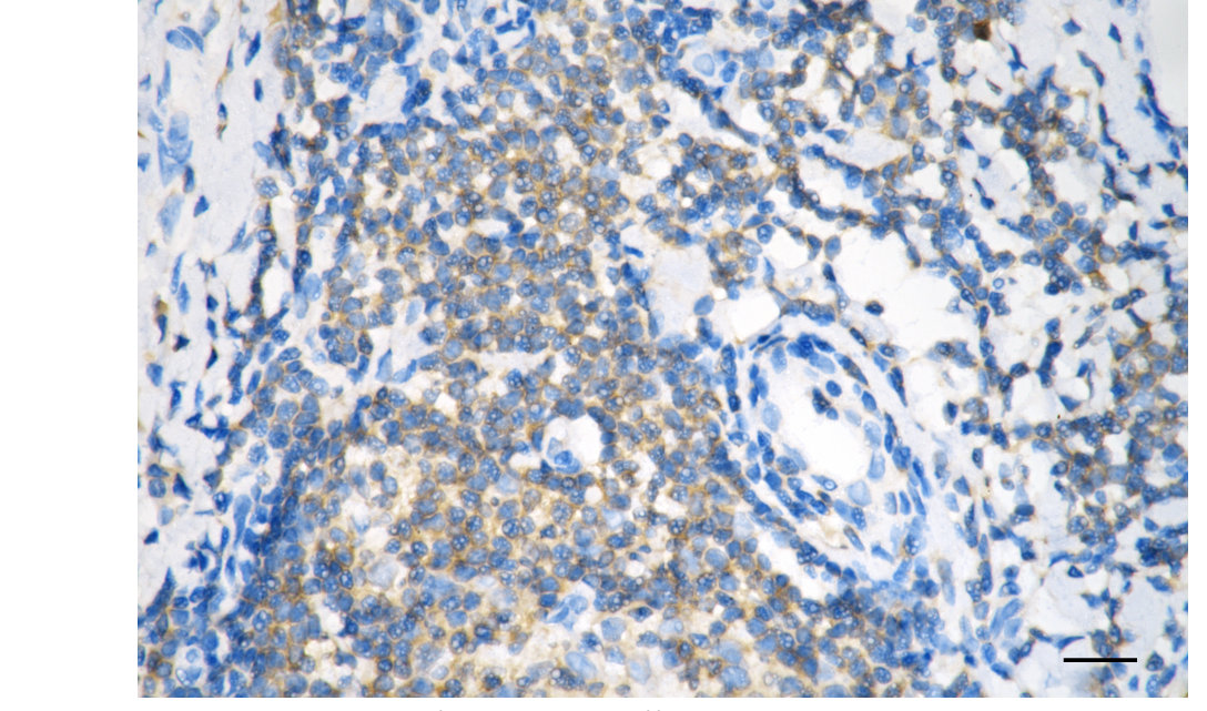 Immunohistochemistry was performed on paraffin-embedded human breast carcinoma using dynamin 2 antibody. Antigen retrieval was done in sodium citrate buffer (pH 6.0). DAB was used for detection, with hematoxylin counterstaining. Images were acquired using a Nikon Ci-L Plus microscope (40× objective). Scale bar: 25 μm.