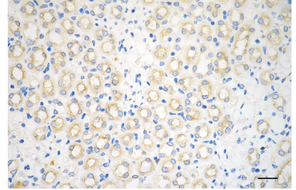 Immunohistochemistry was performed on paraffin-embedded mouse kidney using dynamin 2 antibody. Antigen retrieval was done in sodium citrate buffer (pH 6.0). DAB was used for detection, with hematoxylin counterstaining. Images were acquired using a Nikon Ci-L Plus microscope (40× objective). Scale bar: 25 μm.