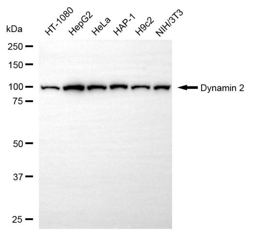 Western blotting analysis using dynamin 2 antibody. Total cell lysates (30 μg) from various cell lines were loaded and separated by SDS-PAGE. The blot was incubated with dynamin 2 antibody and HRP-conjugated goat anti-rabbit secondary antibody respectively.