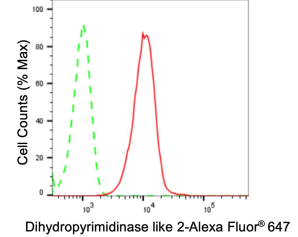 Flow cytometric analysis of Dihydropyrimidinase like 2 expression in C2C12 cells using Dihydropyrimidinase like 2 antibody. Green, isotype control; red, Dihydropyrimidinase like 2