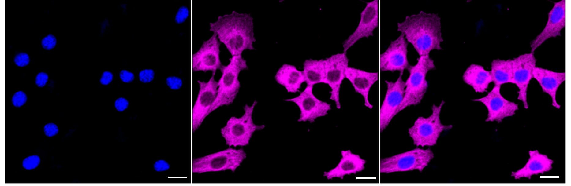 Immunocytochemical staining of C2C12 cells with Dihydropyrimidinase like 2 antibody. Nuclei were stained blue with DAPI; Dihydropyrimidinase like 2 was stained magenta with Alexa Fluor? 647. Images were taken using leica stellaris 5. Protein abundance based on laser intensity and smart gain: Medium. Scale bar: 20 μm.