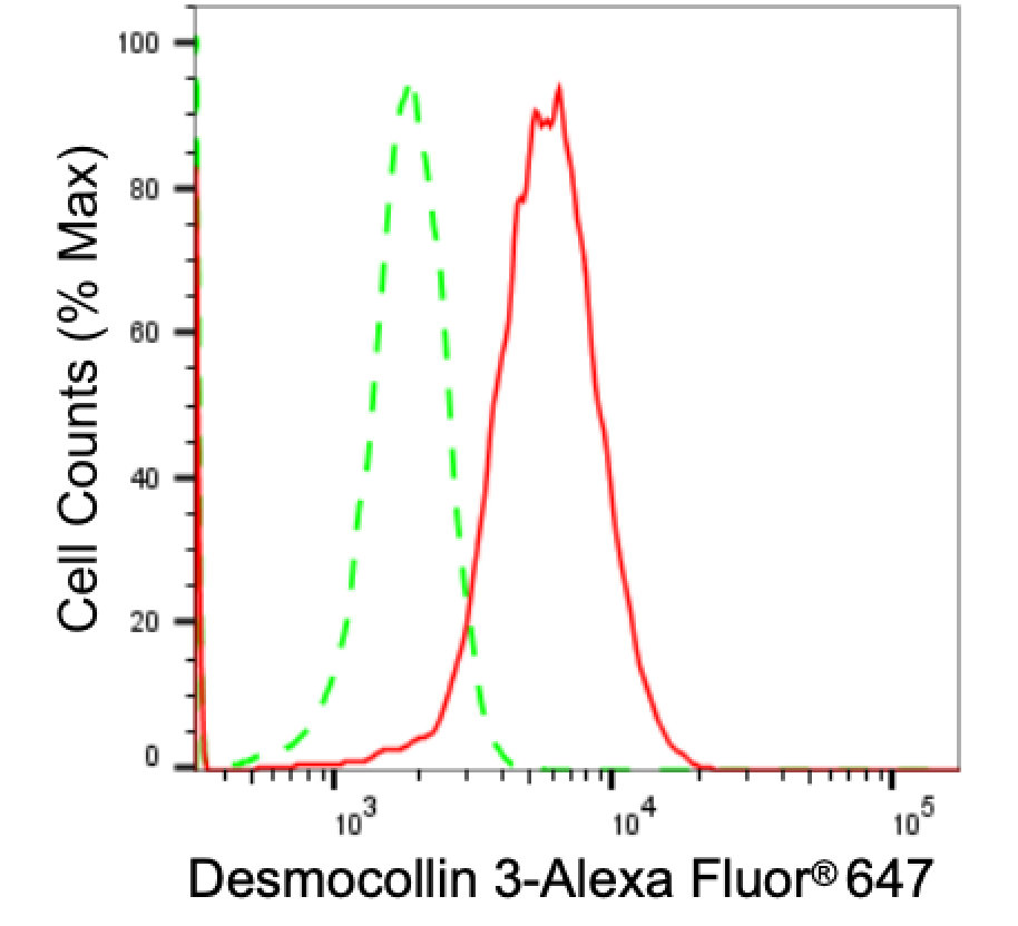 Flow cytometric analysis of Desmocollin 3 expression in HeLa cells using Desmocollin 3 antibody. Green, isotype control; red, Desmocollin 3.