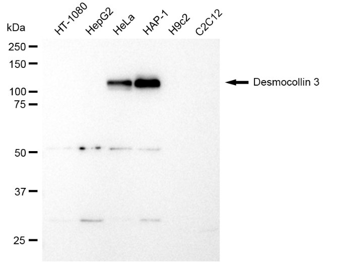 Western blotting analysis using Desmocollin 3 antibody. Total cell lysates (30 μg) from various cell lines were loaded and separated by SDS-PAGE. The blot was incubated with Desmocollin 3 antibody and HRP-conjugated goat anti-rabbit secondary antibody respectively.