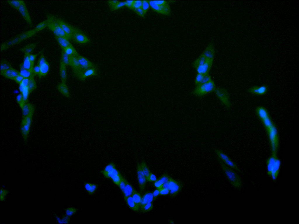 Immunofluorescence staining of Hela cell with CSB-RA821036MA1HU at 1:30 ,counter-stained with DAPI. The cells were fixed in 4% formaldehyde, permeabilized using 0.2% Triton X-100 and blocked in 10% normal Goat Serum. The cells were then incubated with the antibody overnight at 4°C. The secondary antibody was Alexa Fluor 488-congugated AffiniPure Goat Anti-Human IgG(H+L).