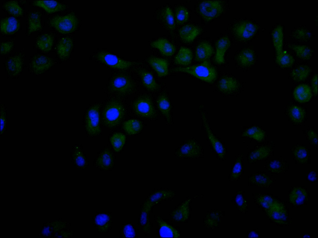 Immunofluorescence staining of Hela cell with CSB-RA020728A0HU at 1:50, counter-stained with DAPI. The cells were fixed in 4% formaldehyde, permeabilized using 0.2% Triton X-100 and blocked in 10% normal Goat Serum. The cells were then incubated with the antibody overnight at 4°C. The secondary antibody was Alexa Fluor 488-congugated AffiniPure Goat Anti-Rabbit IgG(H+L).