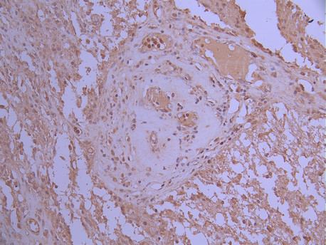 IHC image of CSB-RA020728A0HU diluted at 1:100 and staining in paraffin-embedded human glioma cancer performed on a Leica BondTM system. After dewaxing and hydration, antigen retrieval was mediated by high pressure in a citrate buffer (pH 6.0). Section was blocked with 10% normal goat serum 30min at RT. Then primary antibody (1% BSA) was incubated at 4°C overnight. The primary is detected by a Goat anti-rabbit polymer IgG labeled by HRP and visualized using 0.05% DAB.