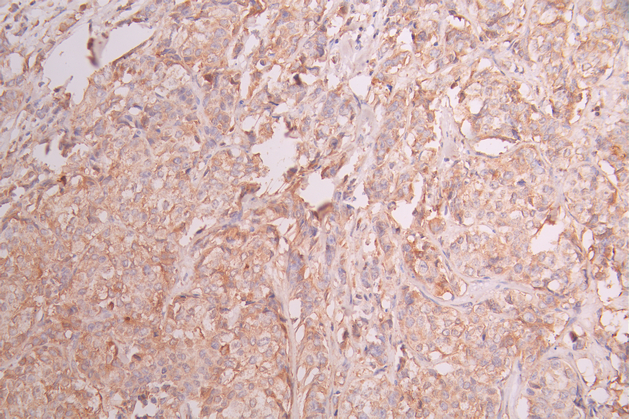 IHC image of CSB-RA215300A0HU diluted at 1:100 and staining in paraffin-embedded human breast cancer performed on a Leica BondTM system. After dewaxing and hydration, antigen retrieval was mediated by high pressure in a citrate buffer (pH 6.0). Section was blocked with 10% normal goat serum 30min at RT. Then primary antibody (1% BSA) was incubated at 4°C overnight. The primary is detected by a Goat anti-rabbit polymer IgG labeled by HRP and visualized using 0.05% DAB.