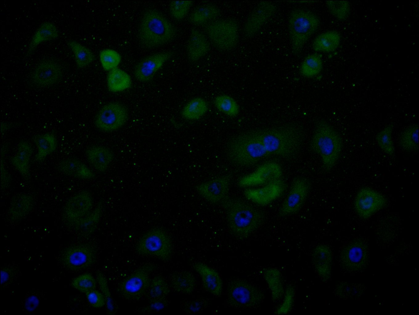 Immunofluorescence staining of Hela cell with CSB-RA149810A0HU at 1:50, counter-stained with DAPI. The cells were fixed in 4% formaldehyde, permeabilized using 0.2% Triton X-100 and blocked in 10% normal Goat Serum. The cells were then incubated with the antibody overnight at 4°C. The secondary antibody was Alexa Fluor 488-congugated AffiniPure Goat Anti-Rabbit IgG(H+L).